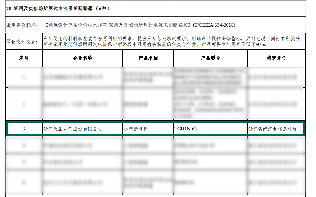 天正电气积极贯彻绿色制造理念,此次入选的 TGB1N-63小型断路器实现了产品全生命周期的绿色化,将生态绿色设计理念融入到产品设计、原材料获取、生产制造、包装运输等各个环节,从而实现产品对能源资源消耗最低化、生态环境影响最小化、可再生率最大化。