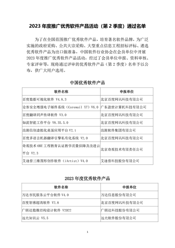 【软件】2023年度推广优秀软件产品活动(第2季度)通过名单