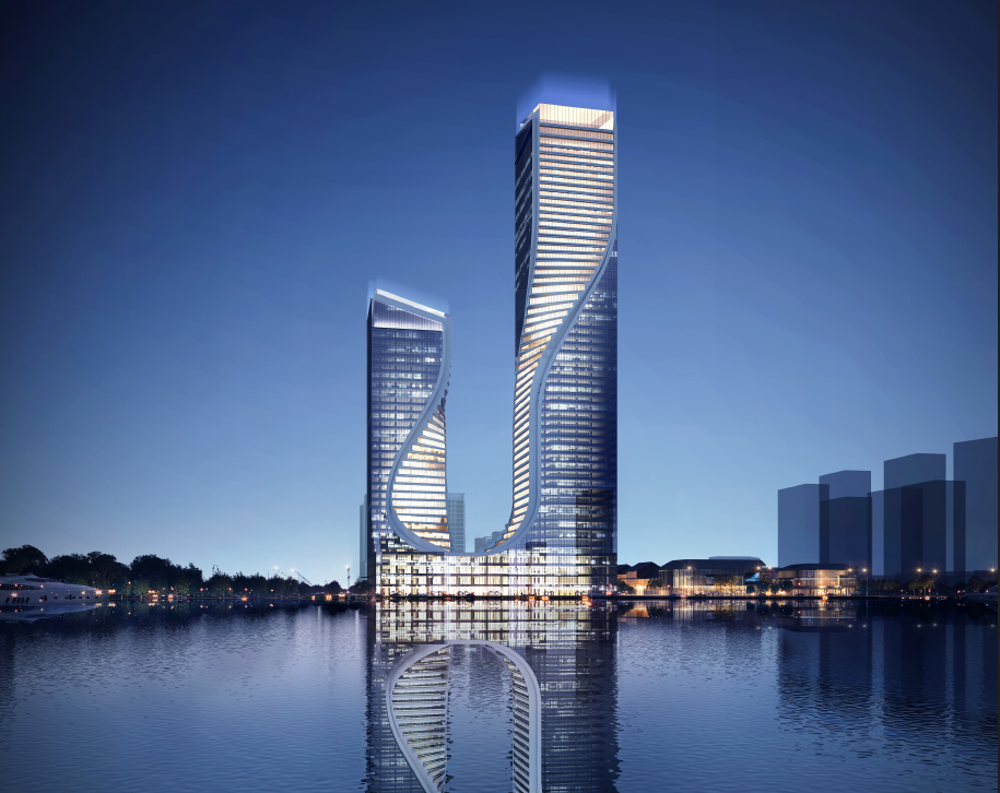 整体布局以两栋超高层塔楼建筑为重点,两栋塔楼打破常规,运用参数化设计,利用平面局部变化,形成连续扭转的立面效果,规律形态变化的同时,保证内部空间高效规整。